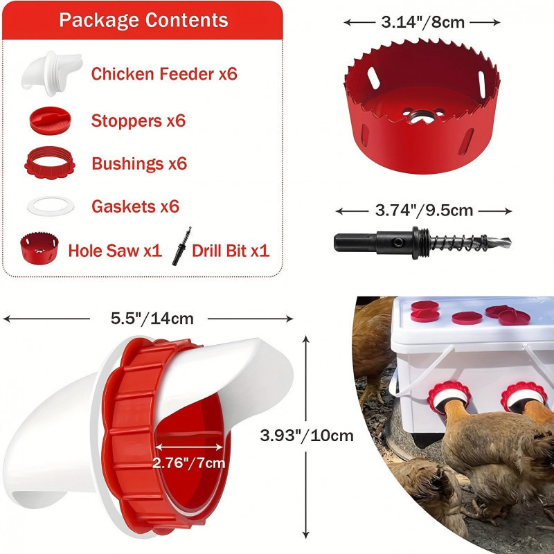 Ez a 6db-os Esőálló baromfi etető szett garantálja, hogy a barátkáid mindig jól táplálva lesznek anélkül, hogy pazarolnád az eledelt! ️ A praktikus eszköz minőségi anyagból készült, így biztos lehetsz benne, hogy hosszú ideig szolgál majd nektek! Az automatikus etető rendszeren keresztül biztosítva van az egyszerű adagolás, amely minimalizálja az étel pazarlását. A 6 etető nyílással minden tyúk megkapja a megfelelő táplálékot, éppen időben.