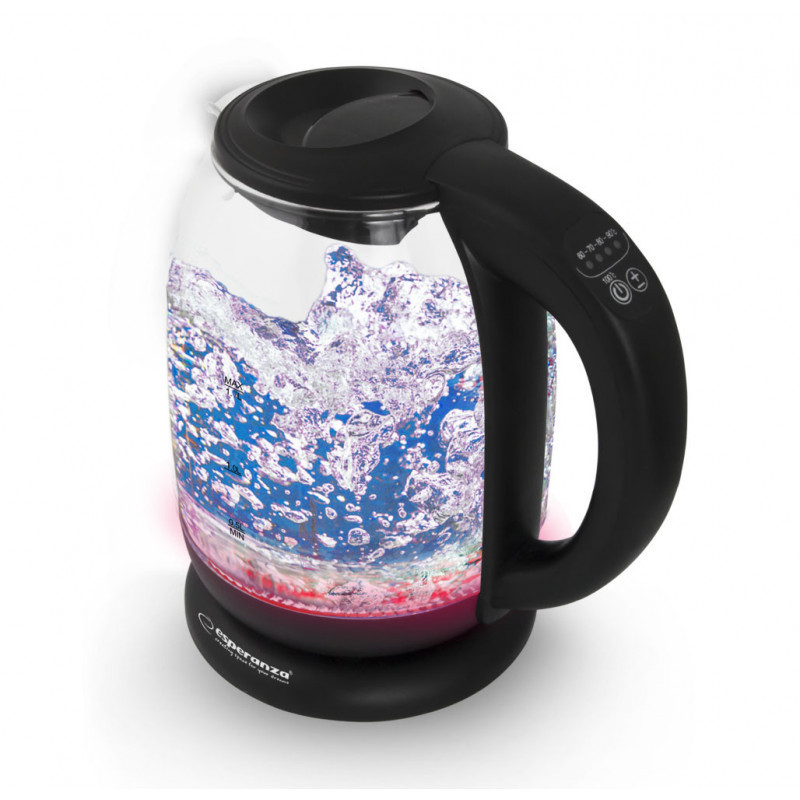 Az üveg, vezeték nélküli Esperanza LOIRE elektromos vízforraló hőmérséklet-szabályozással egy újdonság a tea, gyógynövények és más infúziók kedvelői számára, amelyek különböző áztatási hőmérsékletet igényelnek. A forraló felmelegíti a vizet 60°C, 70°C, 80°C és 90°C-ig. Azok, akik a fekete teát részesítik előnyben, forralhatják a vizet. Minden hőmérsékletnek más színű a forraló háttérvilágítása, a funkcióválasztást hangjelzés kíséri.