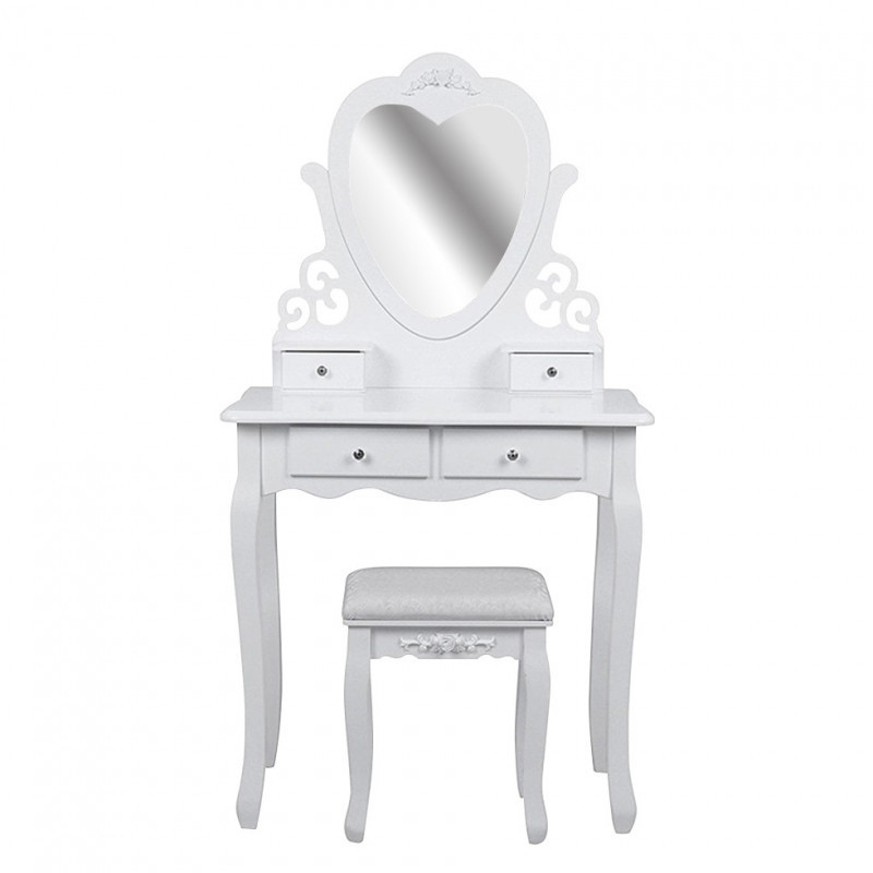 Felső tükrös, polcos része levehető, így akár íróasztalként is funkcionálhat. Domború díszítései klasszikus megjelenést kölcsönöznek az asztalnak és a széknek. Minden típus esetében tartozik szék a fésülködő asztalhoz, aminek felső, párnázott része dekoratív kárpittal van ellátva, ezáltal még különlegesebb.