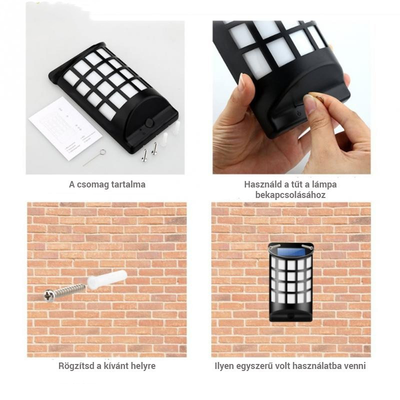 A lámpa napközben a napelem panelen keresztül feltöltődik, alacsony fény esetén az érzékelő automatikusan bekapcsolja és körülbelül 10 órán át világít a lánghatású kellemes, meleg fehér fénye.