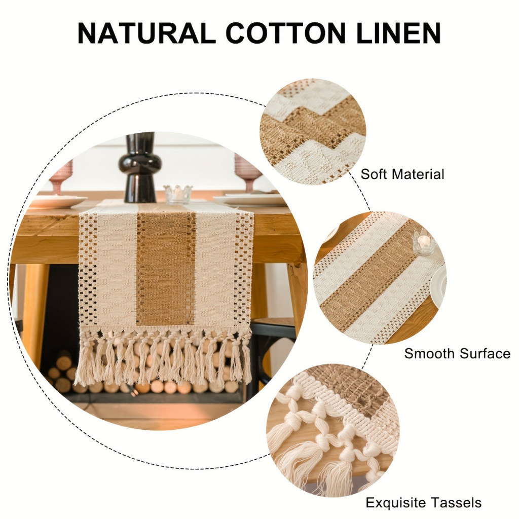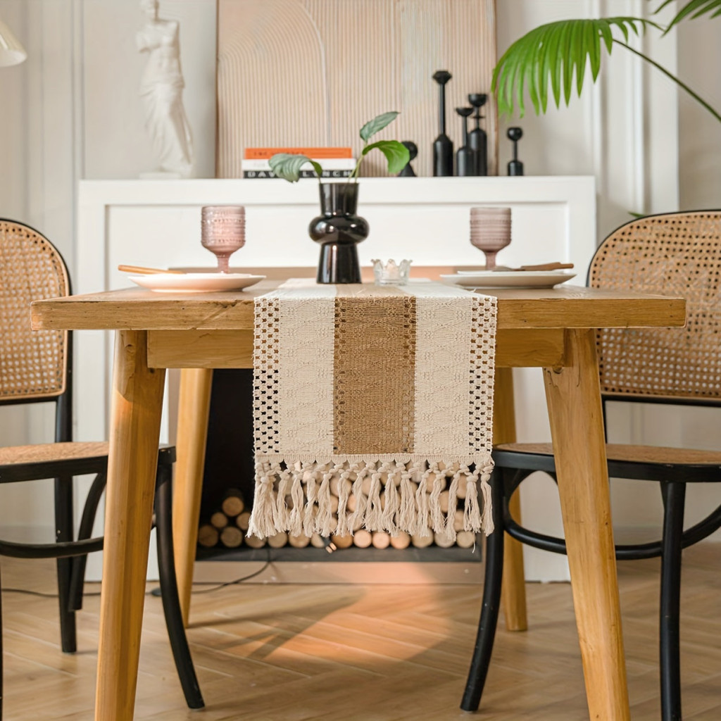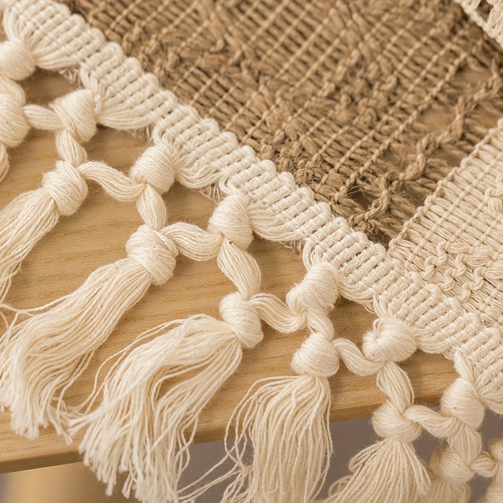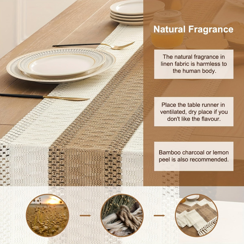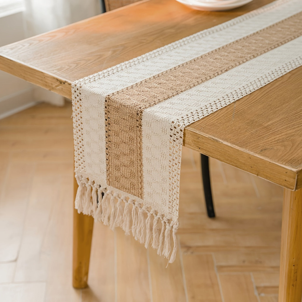(Bojtos Végek) A futó végein található bojtos díszítés elegáns megjelenést biztosít, amely tökéletesen kiegészíti az asztal dekorációját, és egy kis játékosságot visz a térbe.
