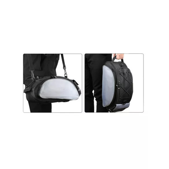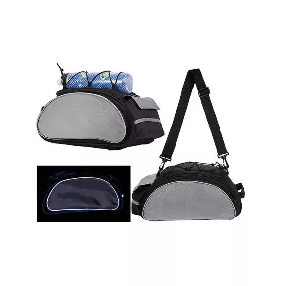 A Bicikli Rácsra Szerelhető Táska egy multifunkciós biciklitáska, amelyet a csomagtartóra lehet felszerelni. Rendkívül hasznos hosszabb biciklitúrákhoz, ruhákat, kisebb tárgyakat, élelmiszert lehet csomagolni. Magas minőségű anyagokból készült. Egy fő rekesz van benne belső zsebbel. Mindkét oldalán cipzáras zsebek találhatók. A táska végén további kisebb Velcro zseb van. A táska fedelet gumipántokkal díszítik, amelyek alatt például egy palackot vagy dzsekit lehet elcsúsztatni. A táska szegélye fényvisszaverő csíkkal van ellátva a biztonságosabb utazáshoz. Az univerzális táska többféle csomagtartó típushoz illik, állítható csattokkal rögzíthető. Válltáskaként is használható, mivel van egy extra pántja, vagy kézben is hordható a fogantyúval. Vízálló anyagból készült, tökéletesen védi a szállított tárgyakat rossz időjárási körülmények között is.