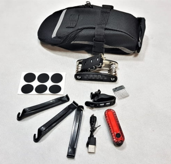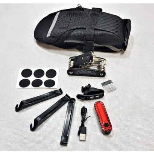 Szerezd be kerékpár javító készletünket, mely minden szükséges eszközt tartalmaz, amire csak szükséged lehet! A készlet egy praktikus táskában érkezik hozzád, melyet kényelmesen magaddal vihetsz a kirándulásra. Szíjának köszönhetően egyszerűen rögzítheted a biciklidre, így probléma esetén azonnal kéznél lehet. Segítségével például könnyedén kezelhetsz egy defektet, vagy meghúzhatod a kilazult csavarokat.