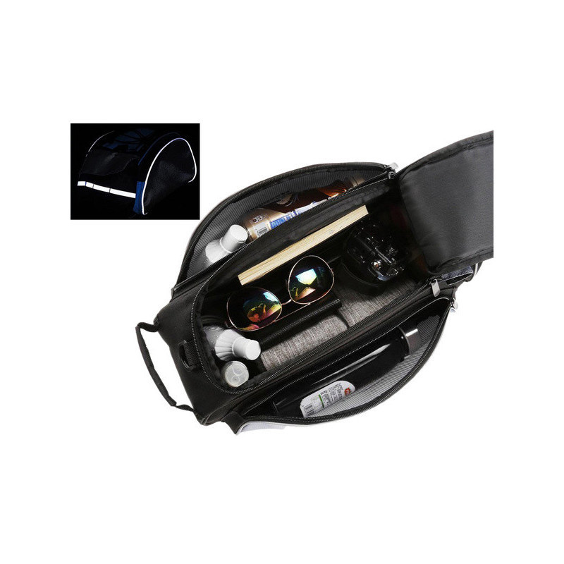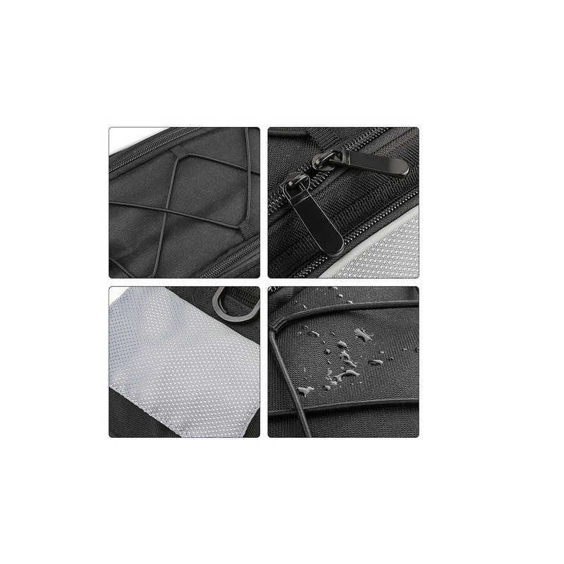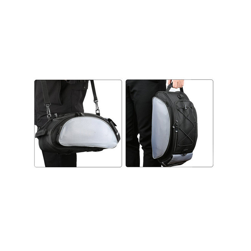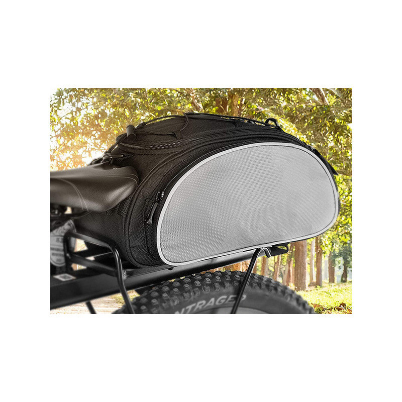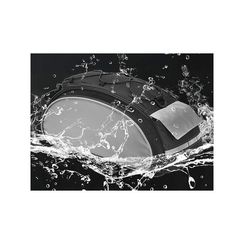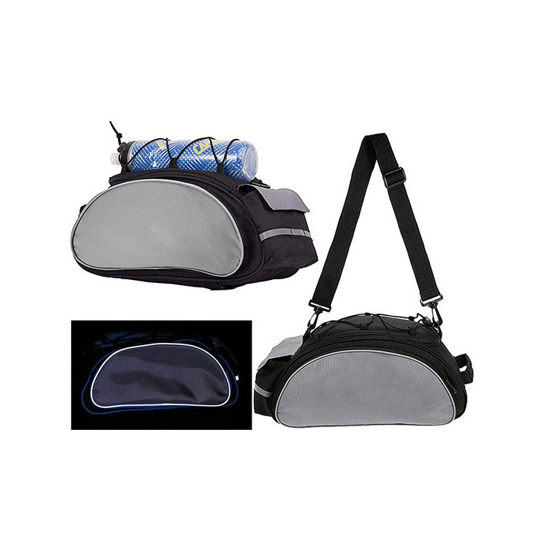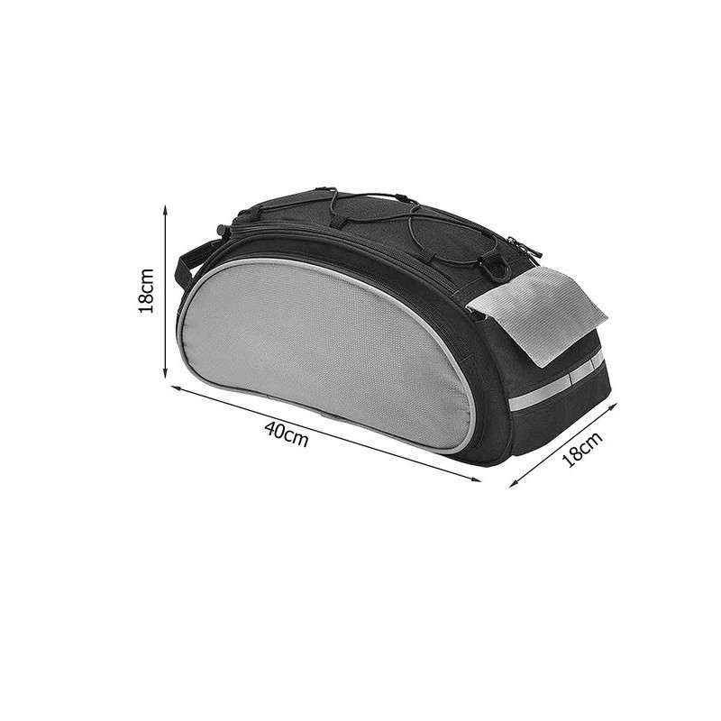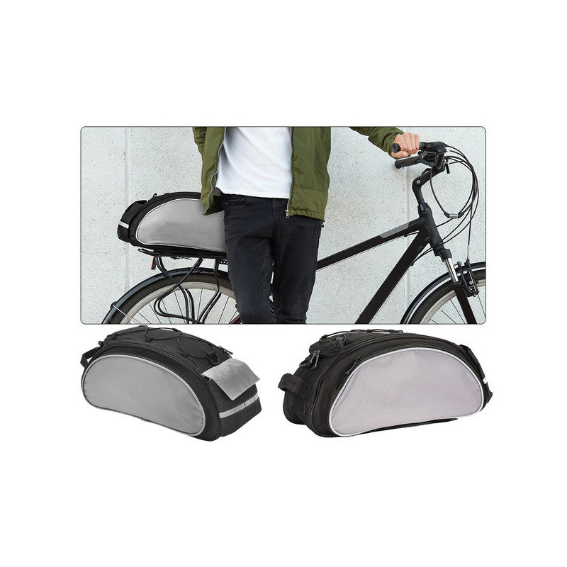 A Bicikli Rácsra Szerelhető Pannier Táska Nagy 13L egy multifunkciós biciklitáska, amelyet a csomagtartóra lehet felszerelni. Rendkívül hasznos hosszabb biciklitúrákhoz, ruhákat, kisebb tárgyakat, élelmiszert lehet csomagolni. Magas minőségű anyagokból készült. Egy fő rekesz van benne belső zsebbel. Mindkét oldalán cipzáras zsebek találhatók. A táska végén további kisebb Velcro zseb van. A táska fedelet gumipántokkal díszítik, amelyek alatt például egy palackot vagy dzsekit lehet elcsúsztatni. A táska szegélye fényvisszaverő csíkkal van ellátva a biztonságosabb utazáshoz. Az univerzális táska többféle csomagtartó típushoz illik, állítható csattokkal rögzíthető. Válltáskaként is használható, mivel van egy extra pántja, vagy kézben is hordható a fogantyúval. Vízálló anyagból készült, tökéletesen védi a szállított tárgyakat rossz időjárási körülmények között is.