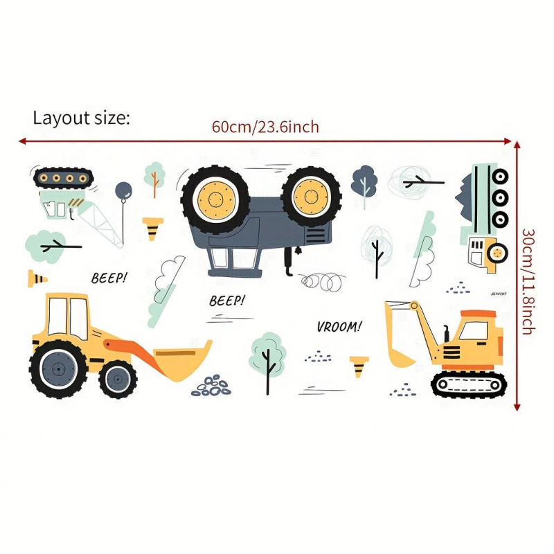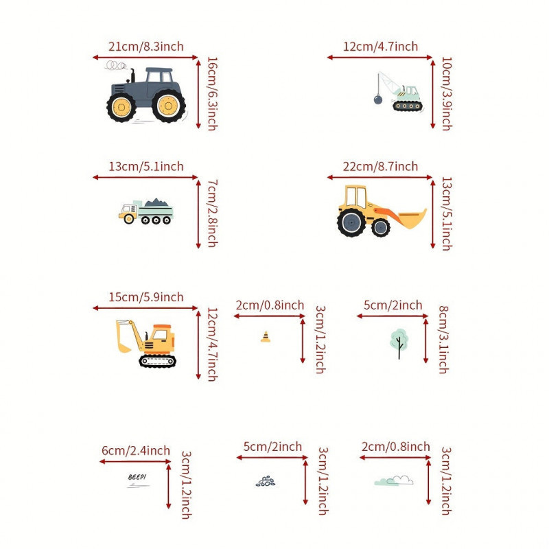 - Fantáziadús minták: A matricák játékos és színes mintázattal rendelkeznek, amelyek a gyermekek képzelőerejét és kreativitását ösztönzik. A kis munkagépek életre kelnek a szoba falán!