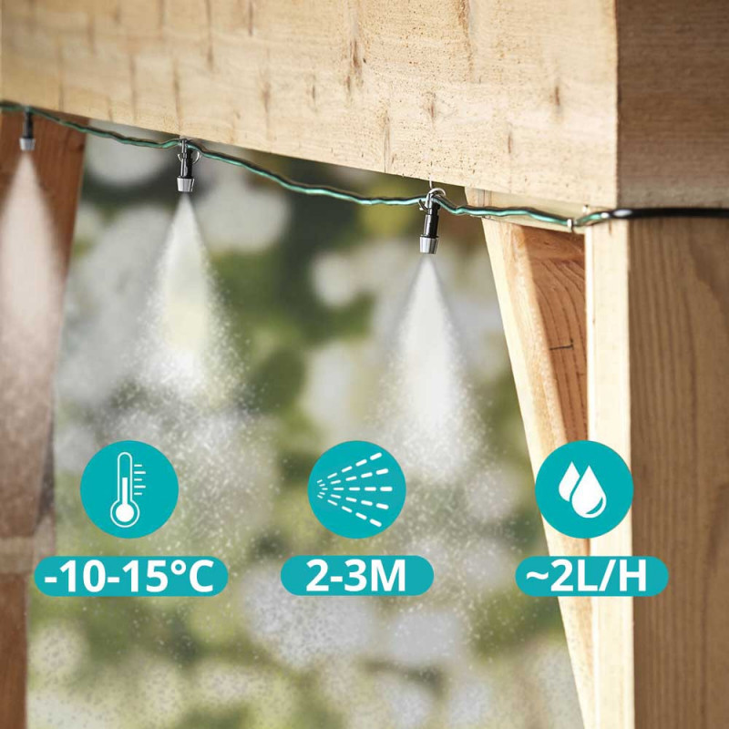 Gazdaságos használata miatt a vízfogyasztása 2L/szórófej/óra. A 10 méteres csövön 10 db porlasztófej található méterenként. Rögzítéséhez 11 db gyorskötözőt is mellékelünk a csomagban.