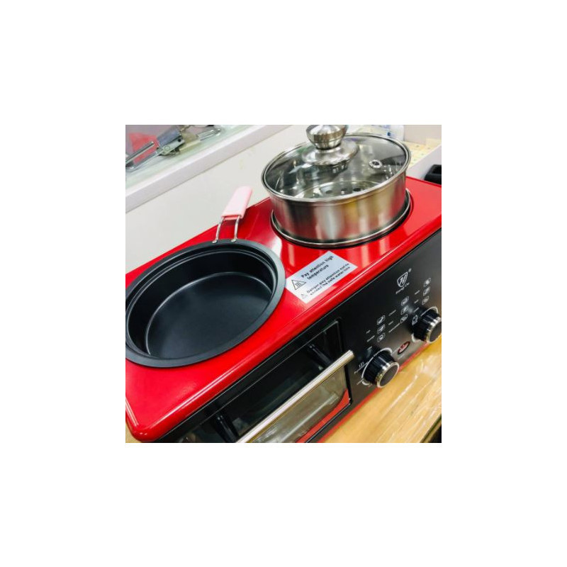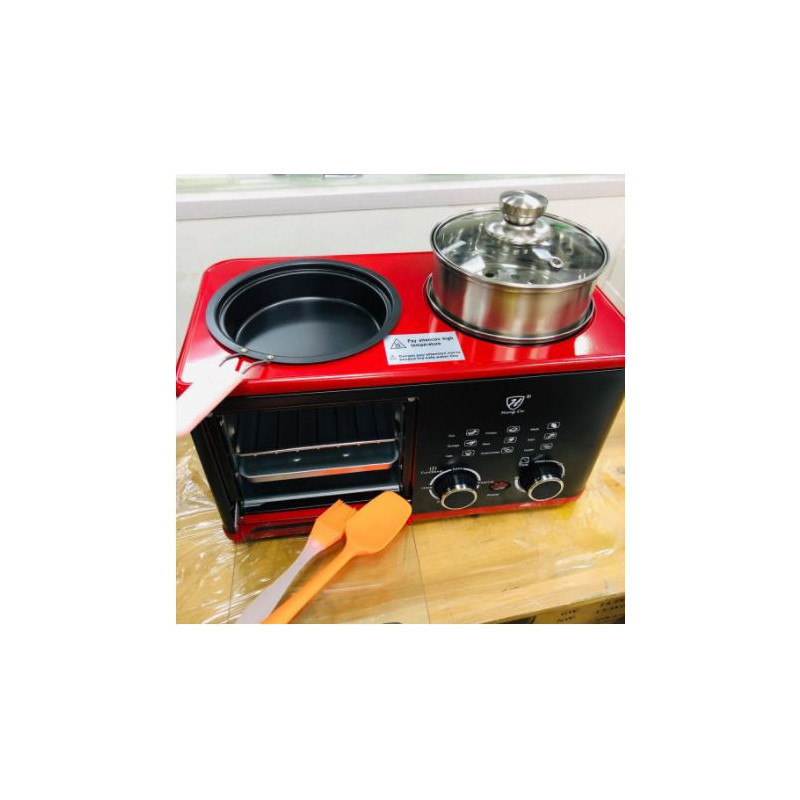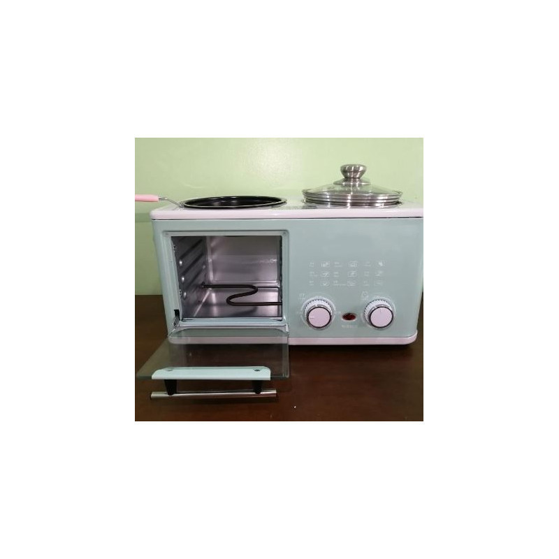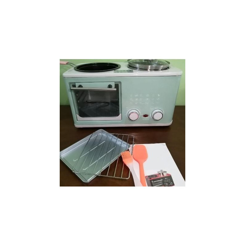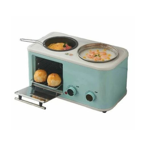 Multifunkciós 3 in 1 reggeli készítő gép, grill funkcióval, beépített főző edényel, kenyér és szalonna pirítóval.