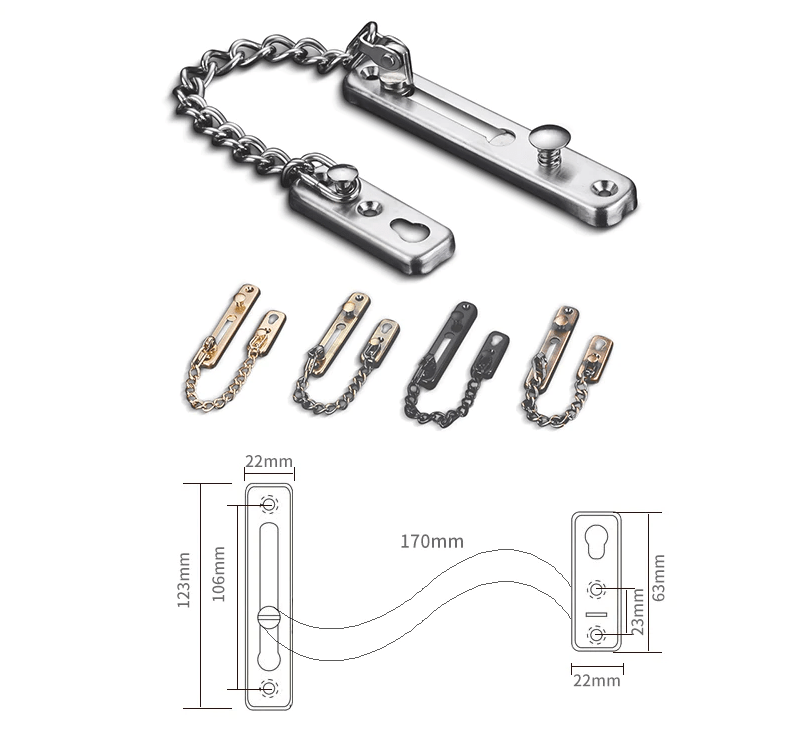 A biztonságvédelmi lánc rozsdamentes acélból készül, így garantáltan extra erős és tartós eszköz. Multifunkciós eszköz, mely egyaránt védelmet nyújt a betolakodók ellen otthoni használat esetén vagy szállodai ajtóra történő telepítés esetén.