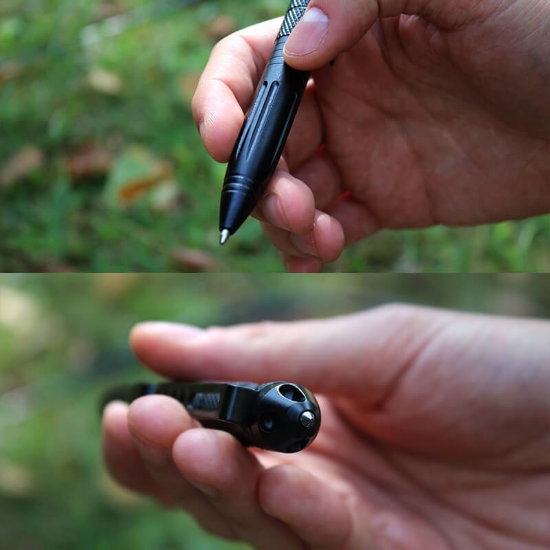 Pehelykönnyű, masszív darab. A karbid hegy miatt üvegtörésre használhatod vészhelyzet esetén. Másik vége toll, amiben szabványos tollbetét cserélhetsz. Ezt is rá tudod csíptetni a ruhádra, a hátizsákodra vagy ahol kényelmes.