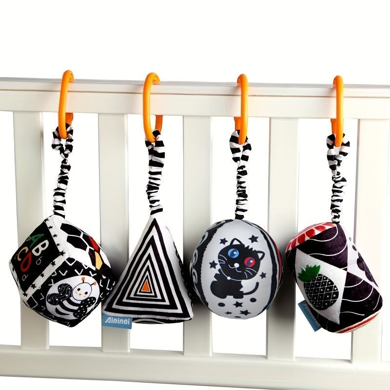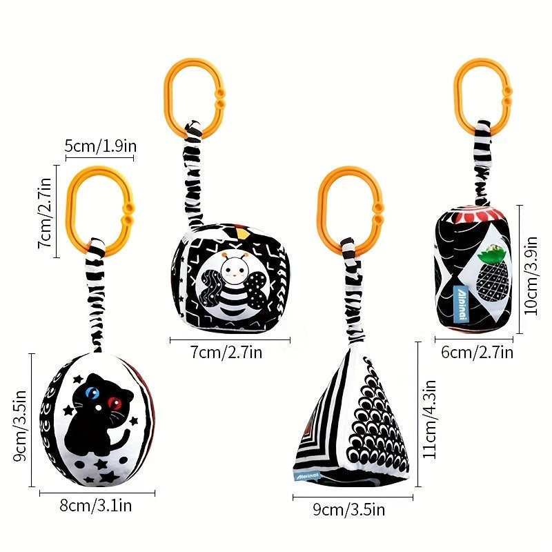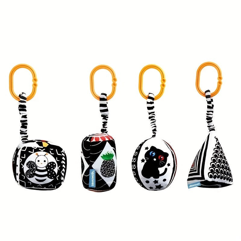 Tulajdonságok: (Szórakoztatás) A fekete-fehér mintázatokat nézve a csecsemők figyelme fokozódik, ezáltal megnyugtatja és fejleszti az őket. (Megértheti a textúrát) A különböző anyagok és formák tapintásra való felfedezése segíti a kisgyermekeket a világ felfedezésében. (Könnyen csatlakoztatható) Egyszerűen rá tudod kötni a játékot a babakocsi fogantyújára, így mindig kéznél van, amikor szükség van rá. (Mobil) A hordozható méretnek köszönhetően bárhová magaddal viheted, hogy mindig legyen szórakoztató elfoglaltság a kisbabád számára. (Biztonság) Speciális kialakítása miatt nincs benne apró elem, így teljesen biztonságos a kisgyermekek számára.